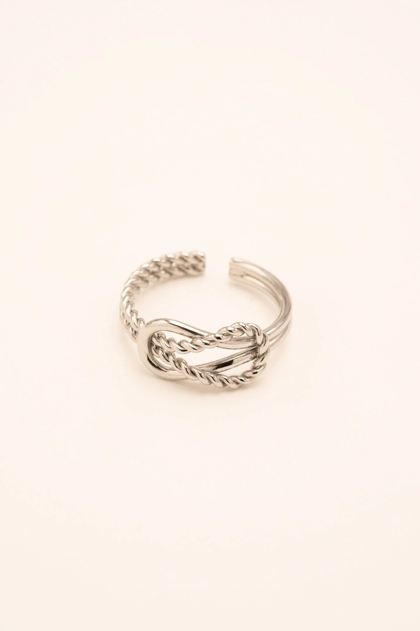 Bague en acier inoxydable ornée d'un noeud, lisse et tressé.
