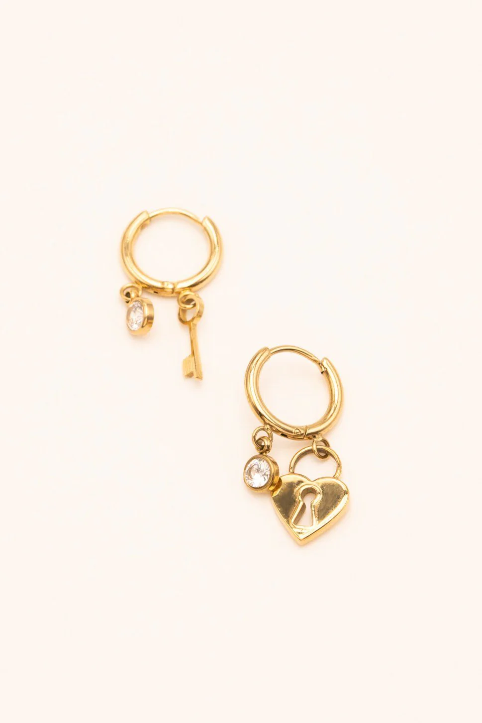 Boucles d'oreilles type créoles à fermoir charnière ornées d'un pendentif cadenas en forme de coeur et d'un zirconium sur une boucle; sur l'autre boucle de sa clef et d'un petit zirconium.