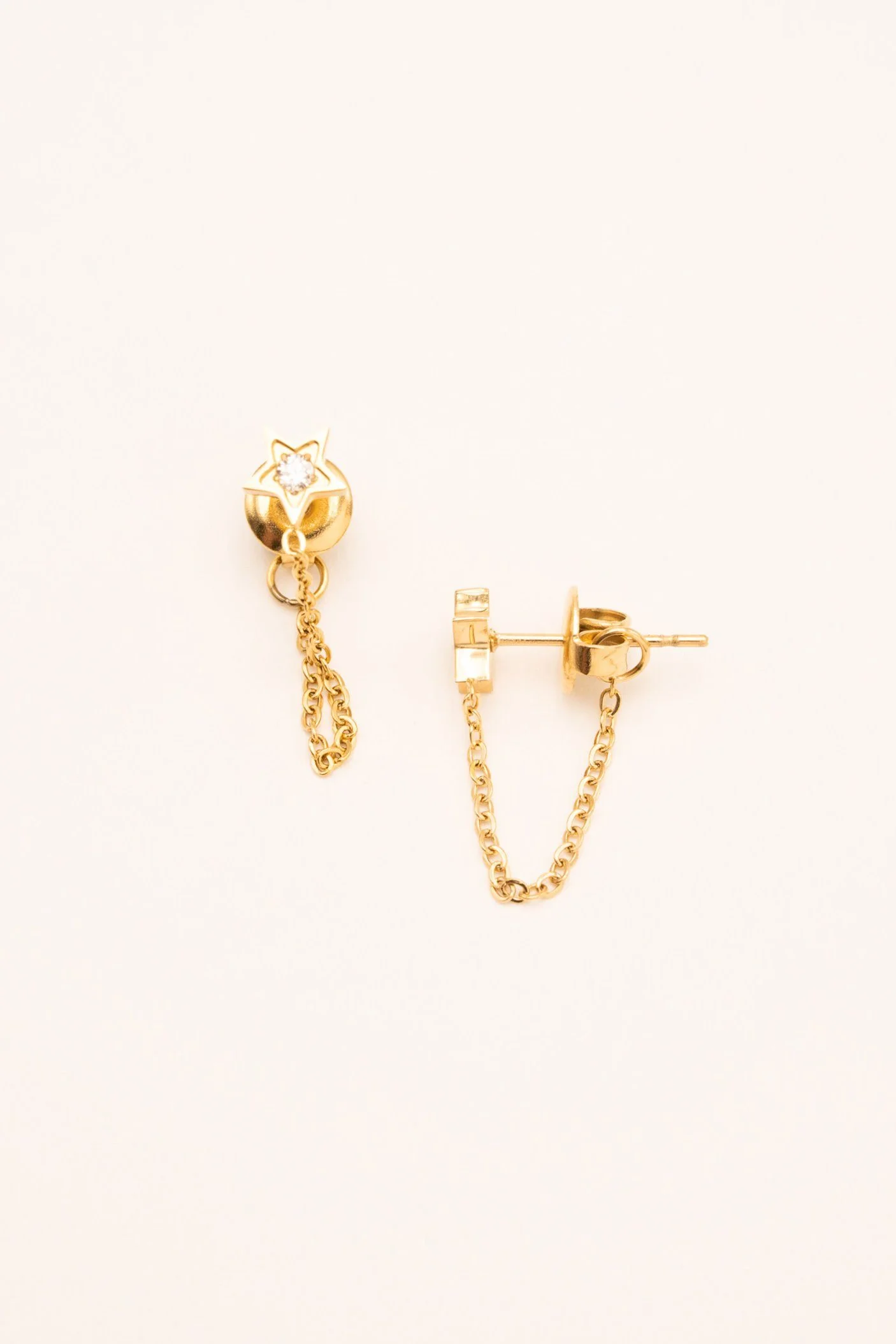 Boucles d'oreilles puces en acier inoxydable ornées d'une étoile sertie d'un zirconium et d'une chaîne accrochée au fermoir papillon.