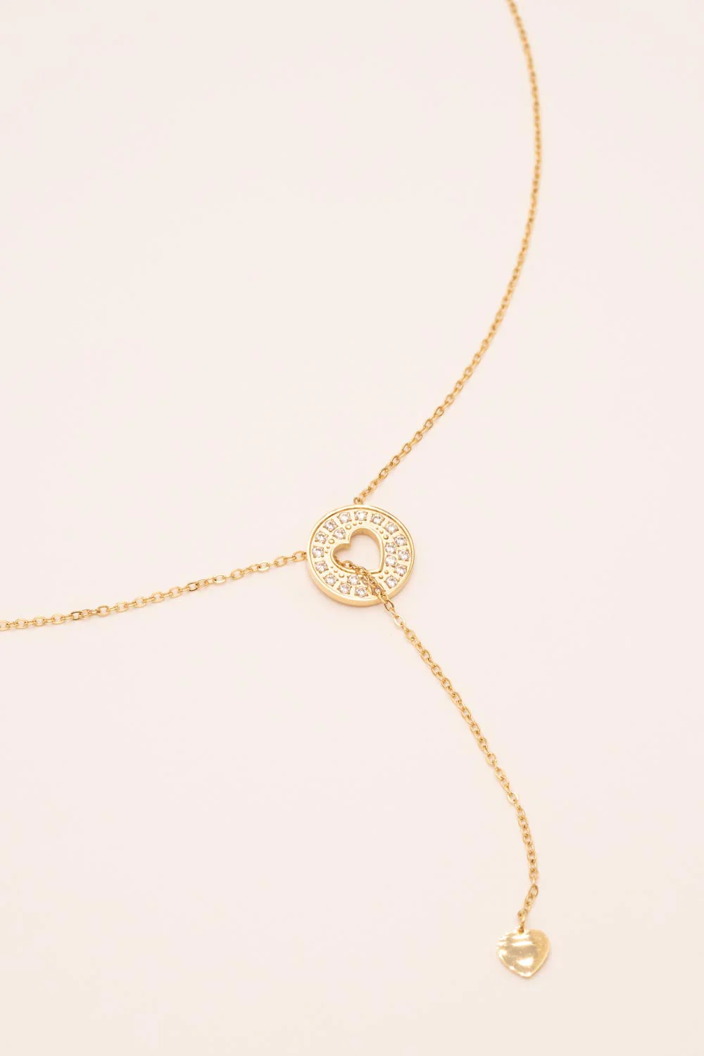 Collier en Y en acier inoxydable composé d'un pendentif serti d'oxydes de zirconium et d'un coeur ajouré. La chaîne traversante n'est pas coulissante et est soudée au pendentif.