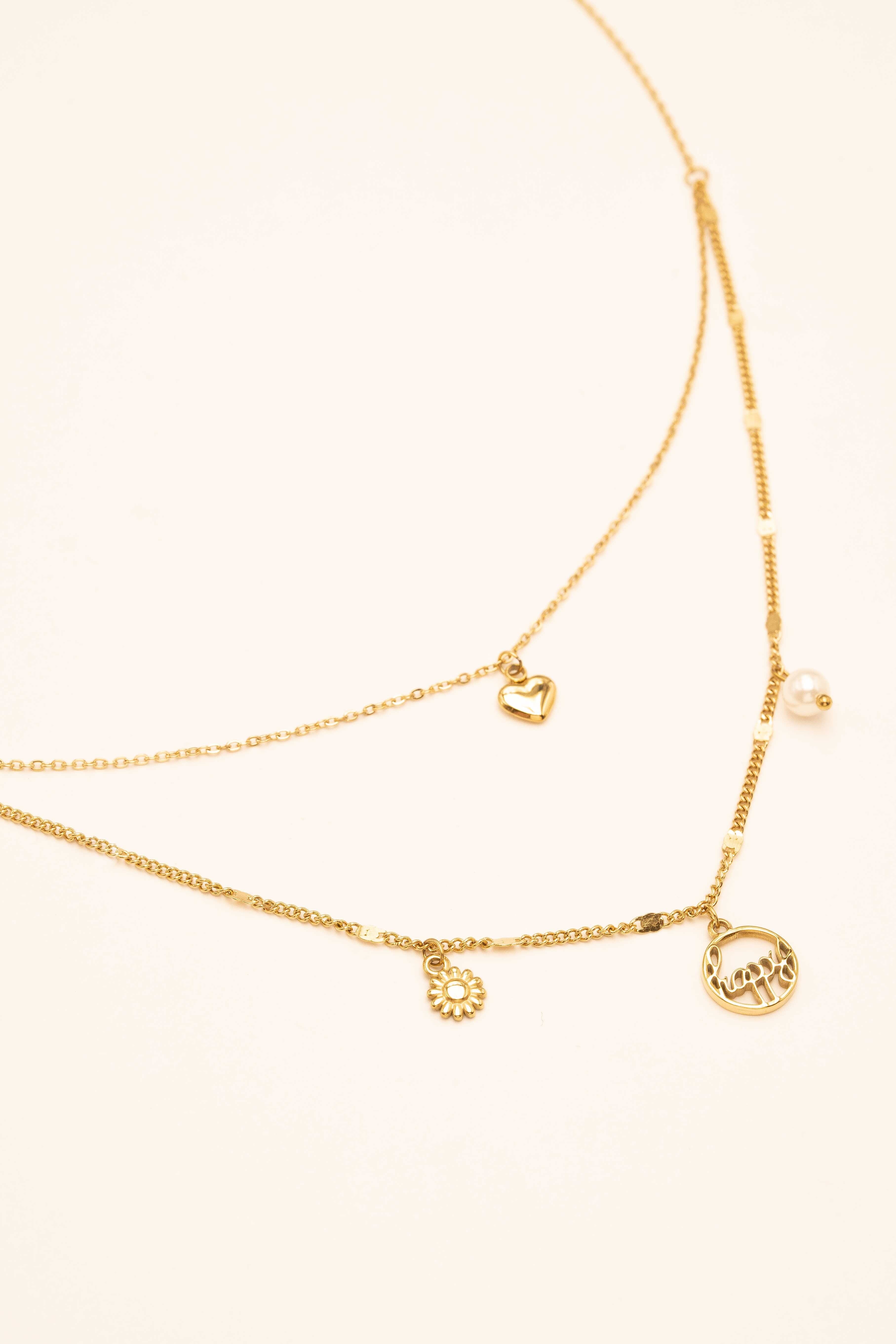 Collier sur chaîne en acier inoxydable composé de deux rangs et de breloques (coeur, fleur, "happy", boule nacrée).