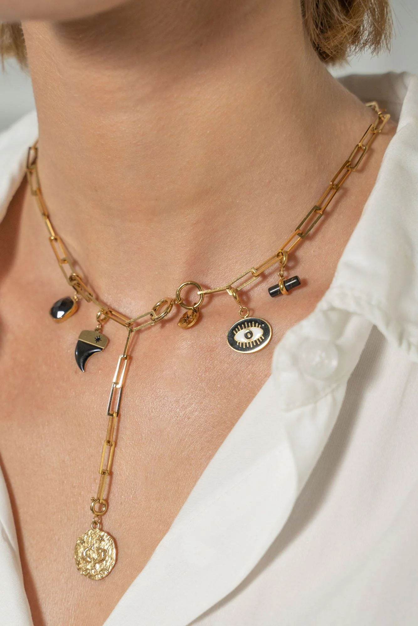 Charms en acier inoxydable, serti d’un pierre naturelle en Agate Noire, à accumuler et à clipser avec amour.