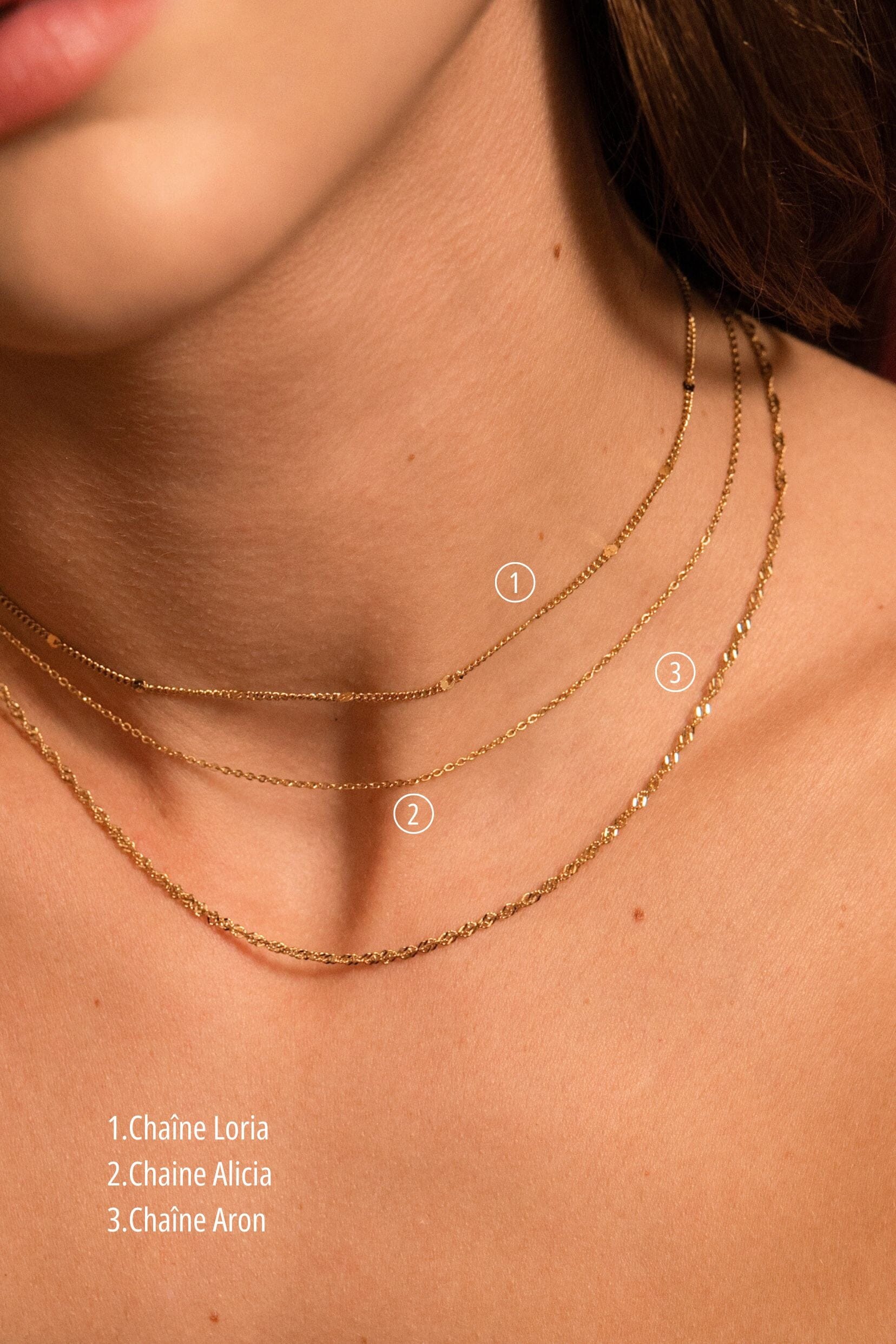- Alicia : maille forçat, longueur 37 cm + une chaîne de réglage de 7 cm.